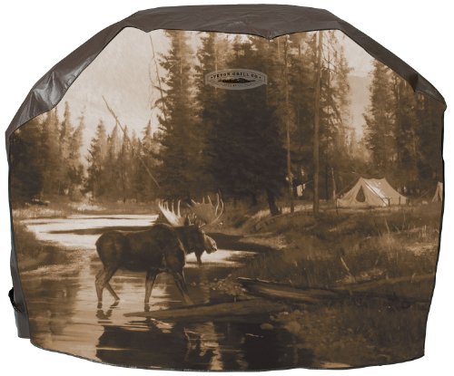 This grill cover is sure to keep your grill safe from weather damage. Includes a classic cabin with moose scene silk-screened onto extra-heavyweight weatherproof PVC. Extra-heavyweight, weatherproof Brass buckles and wide cinch-tight straps provide secure closure Fully lined to protect grill finish Fits most side-burner grills, so ordinary brands can show some flair.